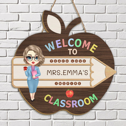 Custom “Welcome to Classroom” Apple-Shaped Wooden Sign – Personalized Teacher Character & Name – Back to School or Teacher Gift