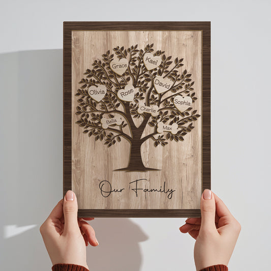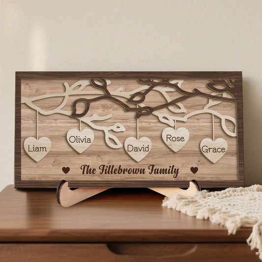 Custom 3-Layer Wooden Family Tree Sign with Hanging Hearts – Personalized Gift for Mom, Dad & Family