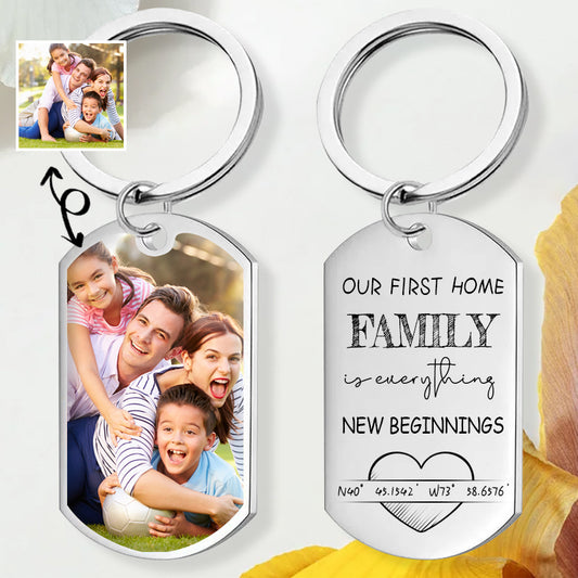 Custom Photo Our First Home – Personalized Keepsake Keychain with Coordinates for Families, Housewarmings, and New Beginnings