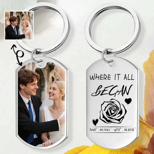 Custom Photo Where It All Began – Personalized Couple Keychain with Coordinates for Anniversaries, Valentine's Day, and Romantic Milestones