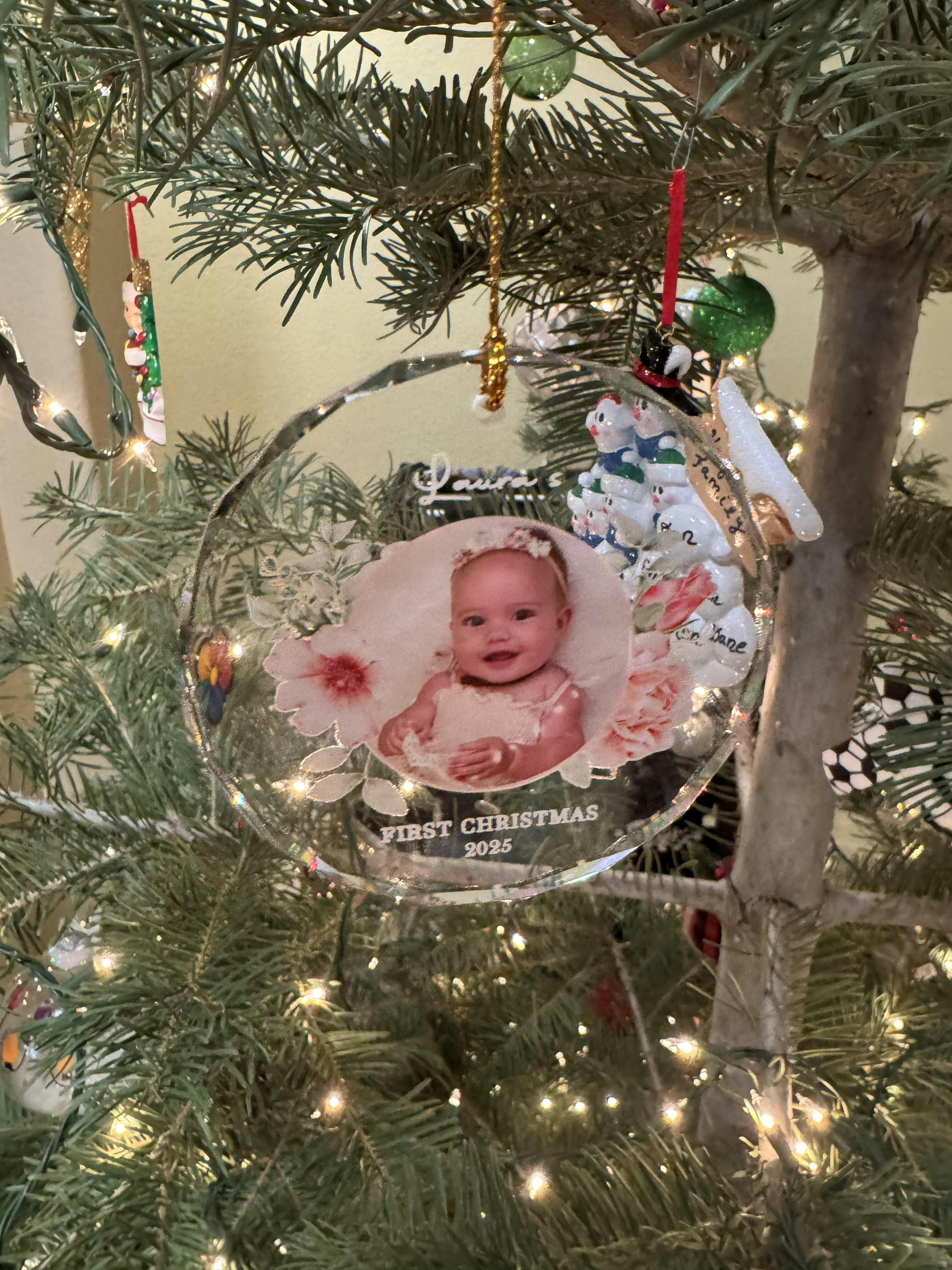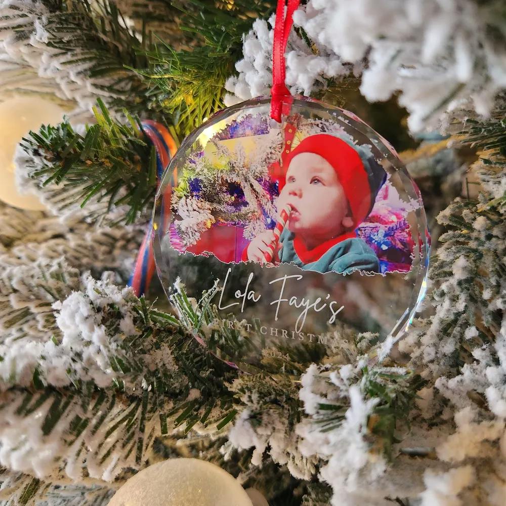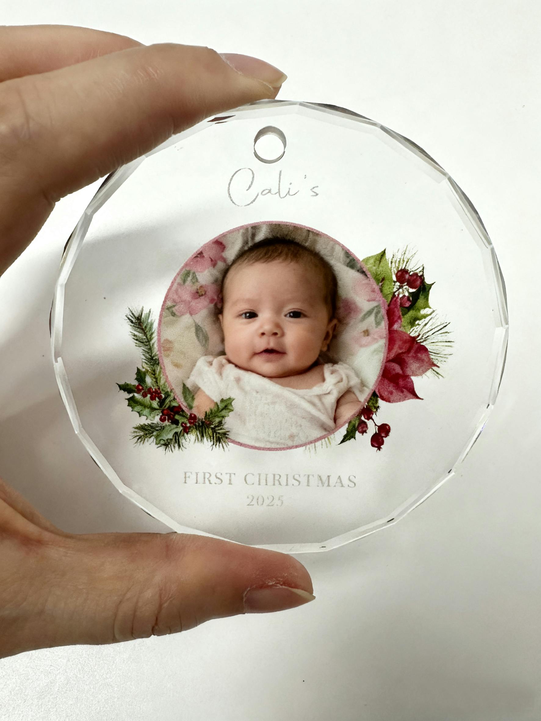 Personalized Baby Photo Ornament – Custom Glass Keepsake for First Christmas 2025 – Floral Gift for Families