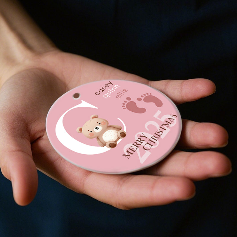 Crafted from smooth, high-quality ceramic, this round ornament features a double-sided design: the front displays your baby’s precious photo, while the back allows you to create a design that’s uniquely theirs. On the left side, choose either a bold A–Z initial or an adorable animal illustration; on the right, add your baby’s full name. Complete the design with charming accents such as hearts, stars, flowers, or tiny footprints, and finish with “MERRY CHRISTMAS” plus your custom year.